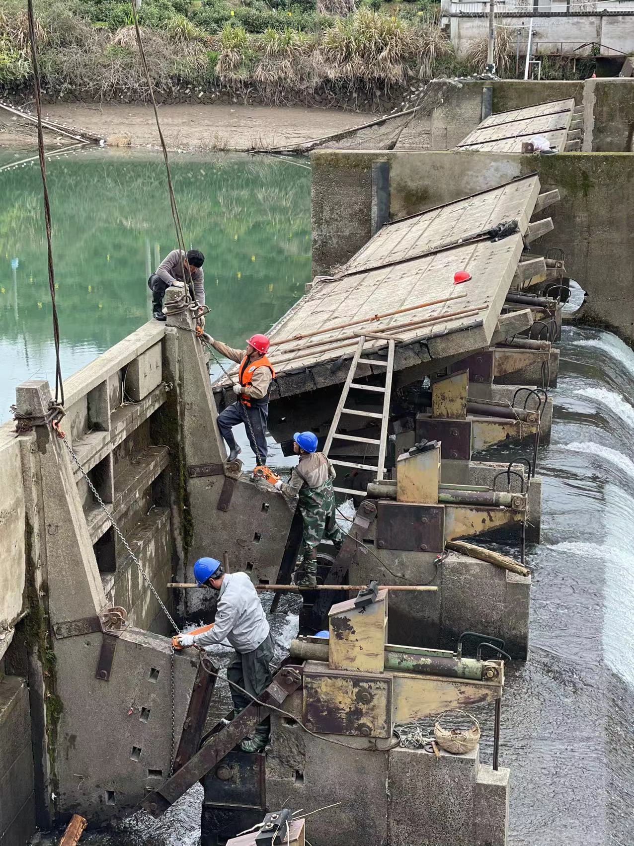 电站管理部部长袁小浩凭借二十余年的电站管理和水电施工经验,按照应急预案相关要求,迅速召集电站负责人及有关技术人员,制定了详细周密的解决方案。但诸多不利条件给整个抢修工作带来了极大的困难,损毁闸门总重达28吨,闸门吊点距吊车距离较远达20米,需要大型吊车才能满足吊装需要;大坝与237国道相邻,且车多路窄,长时间的吊装作业势必对交通造成严重阻碍……时间紧,任务重,又涉及高空作业,现场抢修人员为可能发生的状况做足了充分准备,铆足干劲,与时间赛跑,充分发挥了吃苦耐劳的精神。春寒料峭,山区气温很低,河水冰冷刺骨,抢修人员很快就被雨水湿透,他们咬牙坚持,齐心协力,一鼓作气,圆满打赢了这场设备抢修攻坚战。