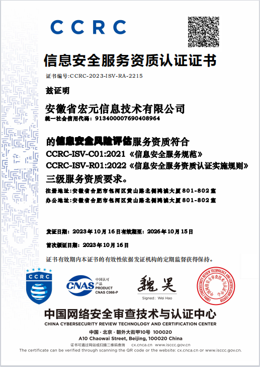 近日,太阳网集团tcy8722所属安徽省宏元信息技术有限公司通过了由中国网络安全审查技术与认证中心颁发的CCRC信息安全服务资质认证。本次获得CCRC信息安全服务资质认证证书,是宏元公司资质储备工作的又一阶段性成果,证明宏元公司在信息安全管理方面已建立了一套科学有效的管理体系,在信息安全服务领域获得了行业权威肯定,在信息安全服务、技术服务能力更上新高。